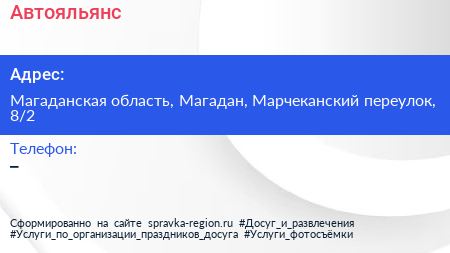 Автояльянс по адресу Магаданская область, Магадан, Марчеканский переулок, 8/2 в дальнейшем Организация, размещена в следующих категориях: