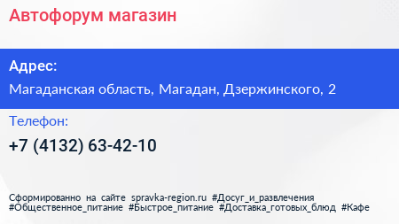 Автофорум, магазин по адресу Магаданская область, Магадан, Дзержинского, 2 в дальнейшем Организация, размещена в следующих категориях: