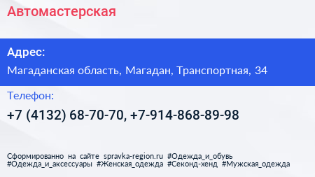 Автомастерская по адресу Магаданская область, Магадан, Транспортная, 34 в дальнейшем Организация, размещена в следующих категориях: