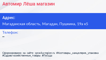 Автомир Лёша, магазин по адресу Магаданская область, Магадан, Пушкина, 19а к5 в дальнейшем Организация, размещена в следующих категориях: