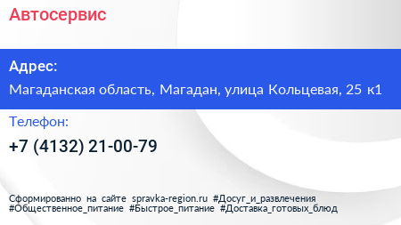 Автосервис по адресу Магаданская область, Магадан, улица Кольцевая, 25 к1 в дальнейшем Организация, размещена в следующих категориях: