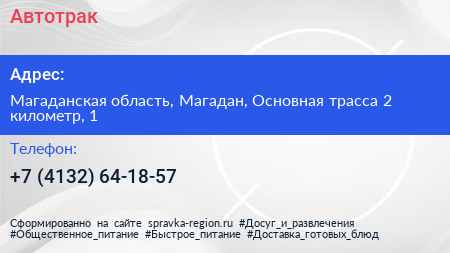 Автотрак по адресу Магаданская область, Магадан, Основная трасса 2 километр, 1 в дальнейшем Организация, размещена в следующих категориях: