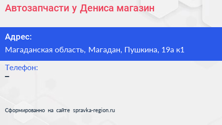Автозапчасти у Дениса, магазин по адресу Магаданская область, Магадан, Пушкина, 19а к1 в дальнейшем Организация, размещена в следующих категориях: