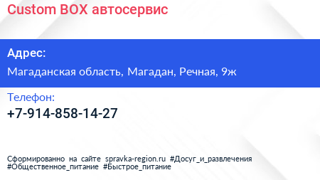 Custom BOX, автосервис по адресу Магаданская область, Магадан, Речная, 9ж в дальнейшем Организация, размещена в следующих категориях: