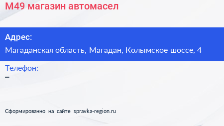 М49, магазин автомасел по адресу Магаданская область, Магадан, Колымское шоссе, 4 в дальнейшем Организация, размещена в следующих категориях: