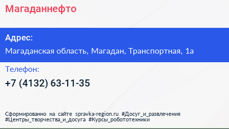 Магаданнефто по адресу Магаданская область, Магадан, Транспортная, 1а в дальнейшем Организация, размещена в следующих категориях: