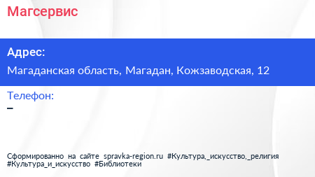 Магсервис по адресу Магаданская область, Магадан, Кожзаводская, 12 в дальнейшем Организация, размещена в следующих категориях: