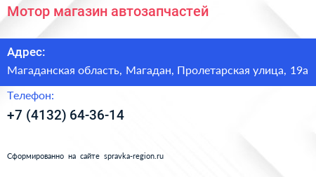 Мотор, магазин автозапчастей по адресу Магаданская область, Магадан, Пролетарская улица, 19а в дальнейшем Организация, размещена в следующих категориях: