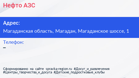Нефто, АЗС по адресу Магаданская область, Магадан, Магаданское шоссе, 1 в дальнейшем Организация, размещена в следующих категориях: