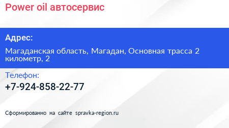 Power-oil, автосервис по адресу Магаданская область, Магадан, Основная трасса 2 километр, 2 в дальнейшем Организация, размещена в следующих категориях: