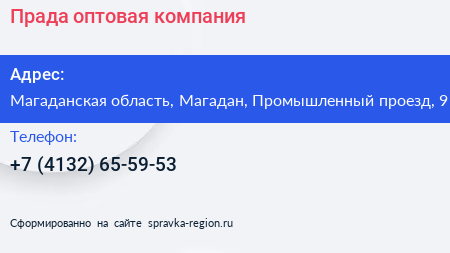 Прада, оптовая компания по адресу Магаданская область, Магадан, Промышленный проезд, 9 в дальнейшем Организация, размещена в следующих категориях: