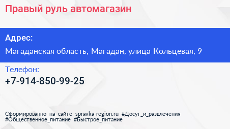 Правый руль, автомагазин по адресу Магаданская область, Магадан, улица Кольцевая, 9 в дальнейшем Организация, размещена в следующих категориях: