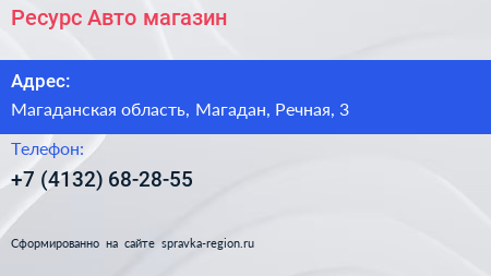 Ресурс-Авто, магазин по адресу Магаданская область, Магадан, Речная, 3 в дальнейшем Организация, размещена в следующих категориях: