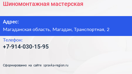 Шиномонтажная мастерская по адресу Магаданская область, Магадан, Транспортная, 2 в дальнейшем Организация, размещена в следующих категориях: