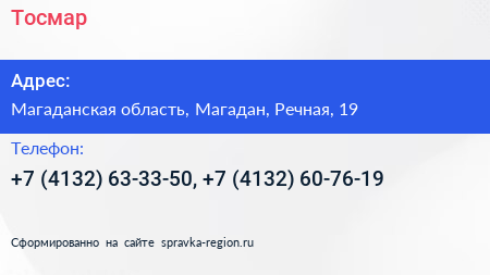 Тосмар по адресу Магаданская область, Магадан, Речная, 19 в дальнейшем Организация, размещена в следующих категориях: