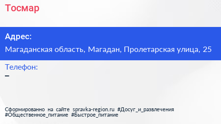 Тосмар по адресу Магаданская область, Магадан, Пролетарская улица, 25 в дальнейшем Организация, размещена в следующих категориях: