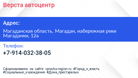 Верста, автоцентр по адресу Магаданская область, Магадан, набережная реки Магаданки, 12а в дальнейшем Организация, размещена в следующих категориях: