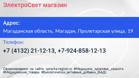ЭлектроСвет, магазин по адресу Магаданская область, Магадан, Пролетарская улица, 19 в дальнейшем Организация, размещена в следующих категориях: