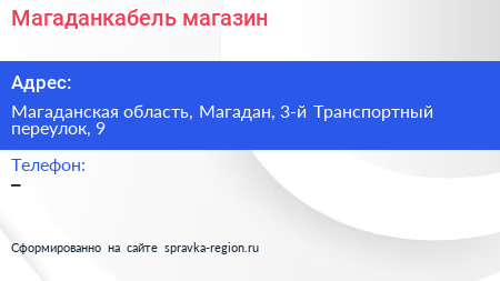 Магаданкабель, магазин по адресу Магаданская область, Магадан, 3-й Транспортный переулок, 9 в дальнейшем Организация, размещена в следующих категориях: