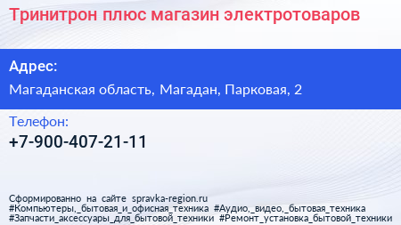 Тринитрон плюс, магазин электротоваров по адресу Магаданская область, Магадан, Парковая, 2 в дальнейшем Организация, размещена в следующих категориях: