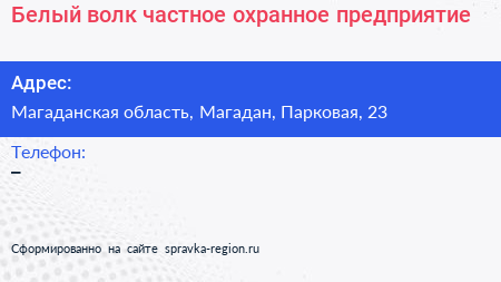 Белый волк, частное охранное предприятие по адресу Магаданская область, Магадан, Парковая, 23 в дальнейшем Организация, размещена в следующих категориях: