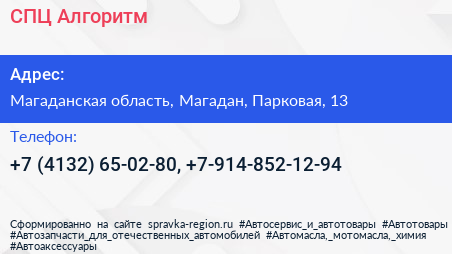 СПЦ Алгоритм по адресу Магаданская область, Магадан, Парковая, 13 в дальнейшем Организация, размещена в следующих категориях: