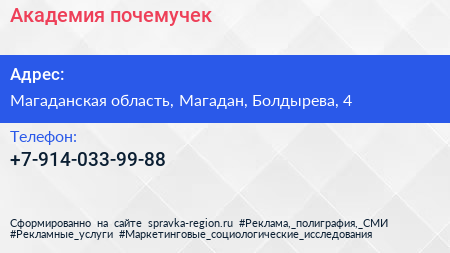 Академия почемучек по адресу Магаданская область, Магадан, Болдырева, 4 в дальнейшем Организация, размещена в следующих категориях: