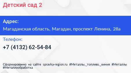 Детский сад №2 по адресу Магаданская область, Магадан, проспект Ленина, 28а в дальнейшем Организация, размещена в следующих категориях: