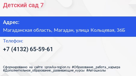 Детский сад №7 по адресу Магаданская область, Магадан, улица Кольцевая, 36Б в дальнейшем Организация, размещена в следующих категориях: