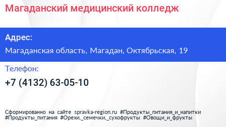 Магаданский медицинский колледж по адресу Магаданская область, Магадан, Октябрьская, 19 в дальнейшем Организация, размещена в следующих категориях: