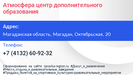 Атмосфера, центр дополнительного образования по адресу Магаданская область, Магадан, Октябрьская, 20 в дальнейшем Организация, размещена в следующих категориях: