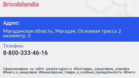 Bricobilandia по адресу Магаданская область, Магадан, Основная трасса 2 километр, 3 в дальнейшем Организация, размещена в следующих категориях: