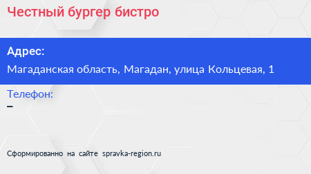 Честный бургер, бистро по адресу Магаданская область, Магадан, улица Кольцевая, 1 в дальнейшем Организация, размещена в следующих категориях:
