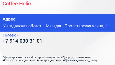 Coffee Holic по адресу Магаданская область, Магадан, Пролетарская улица, 11 в дальнейшем Организация, размещена в следующих категориях: