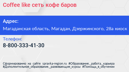 Coffee like, сеть кофе-баров по адресу Магаданская область, Магадан, Дзержинского, 28а киоск в дальнейшем Организация, размещена в следующих категориях: