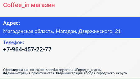 Coffee_in, магазин по адресу Магаданская область, Магадан, Дзержинского, 21 в дальнейшем Организация, размещена в следующих категориях: