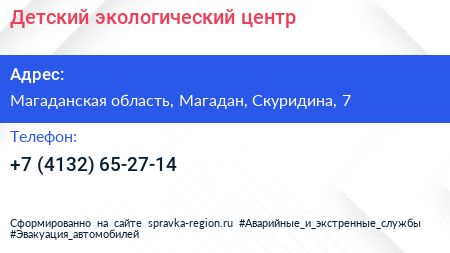Детский экологический центр по адресу Магаданская область, Магадан, Скуридина, 7 в дальнейшем Организация, размещена в следующих категориях: