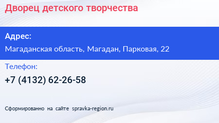Дворец детского творчества по адресу Магаданская область, Магадан, Парковая, 22 в дальнейшем Организация, размещена в следующих категориях: