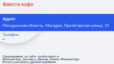 Фиеста, кафе по адресу Магаданская область, Магадан, Пролетарская улица, 11 в дальнейшем Организация, размещена в следующих категориях: