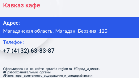 Кавказ, кафе по адресу Магаданская область, Магадан, Берзина, 12Б в дальнейшем Организация, размещена в следующих категориях: