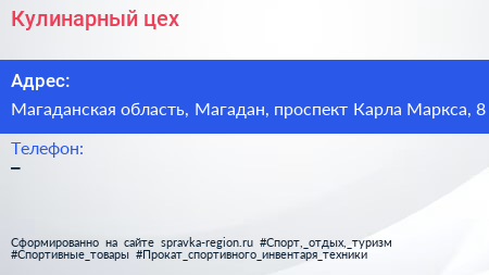 Кулинарный цех по адресу Магаданская область, Магадан, проспект Карла Маркса, 8 в дальнейшем Организация, размещена в следующих категориях: