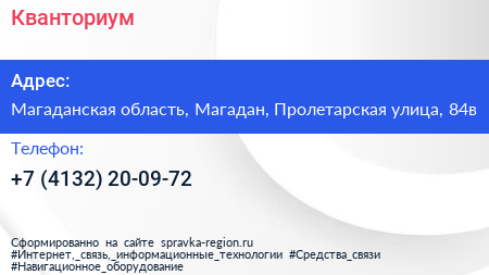 Кванториум по адресу Магаданская область, Магадан, Пролетарская улица, 84в в дальнейшем Организация, размещена в следующих категориях: