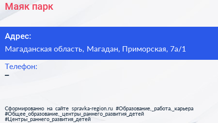 Маяк, парк по адресу Магаданская область, Магадан, Приморская, 7а/1 в дальнейшем Организация, размещена в следующих категориях: