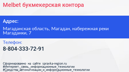 Melbet, букмекерская контора по адресу Магаданская область, Магадан, набережная реки Магаданки, 7 в дальнейшем Организация, размещена в следующих категориях: