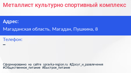 Металлист, культурно-спортивный комплекс по адресу Магаданская область, Магадан, Пушкина, 8 в дальнейшем Организация, размещена в следующих категориях: