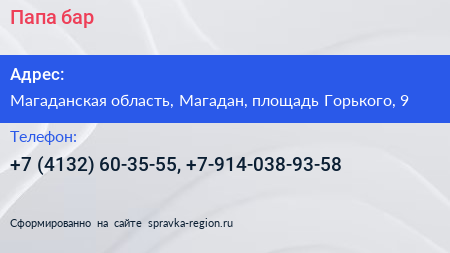 Папа, бар по адресу Магаданская область, Магадан, площадь Горького, 9 в дальнейшем Организация, размещена в следующих категориях: