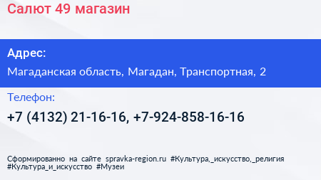 Салют 49, магазин по адресу Магаданская область, Магадан, Транспортная, 2 в дальнейшем Организация, размещена в следующих категориях: