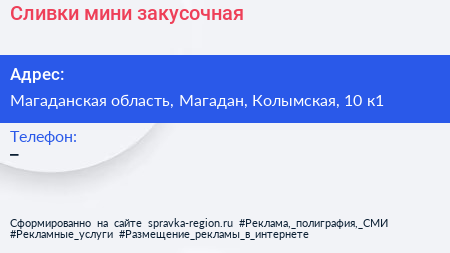 Сливки, мини-закусочная по адресу Магаданская область, Магадан, Колымская, 10 к1 в дальнейшем Организация, размещена в следующих категориях: