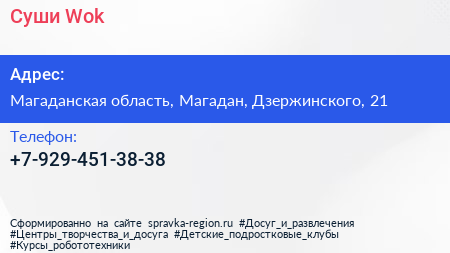 Суши-Wok по адресу Магаданская область, Магадан, Дзержинского, 21 в дальнейшем Организация, размещена в следующих категориях: