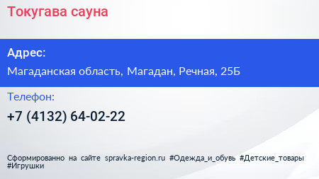 Токугава, сауна по адресу Магаданская область, Магадан, Речная, 25Б в дальнейшем Организация, размещена в следующих категориях: